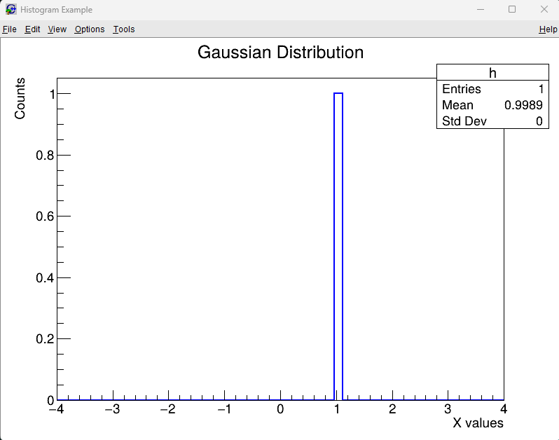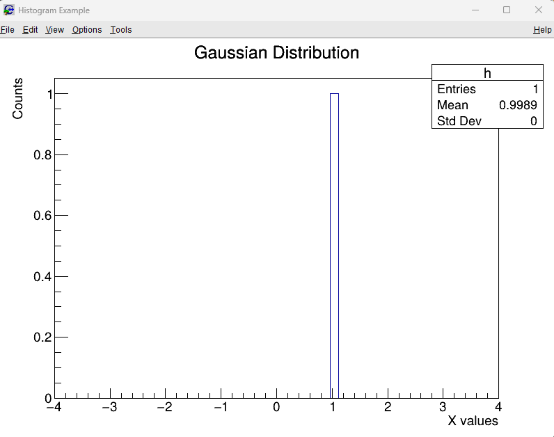 "h"— internal name (like a variable name inside a ROOT file)"Gaussian Distribution; X values; Counts"— plot title and axis labels • Before first;→ Title • Between;→ X-axis label • After last;→ Y-axis label50— number of bins-4, 4— minimum and maximum X-axis values