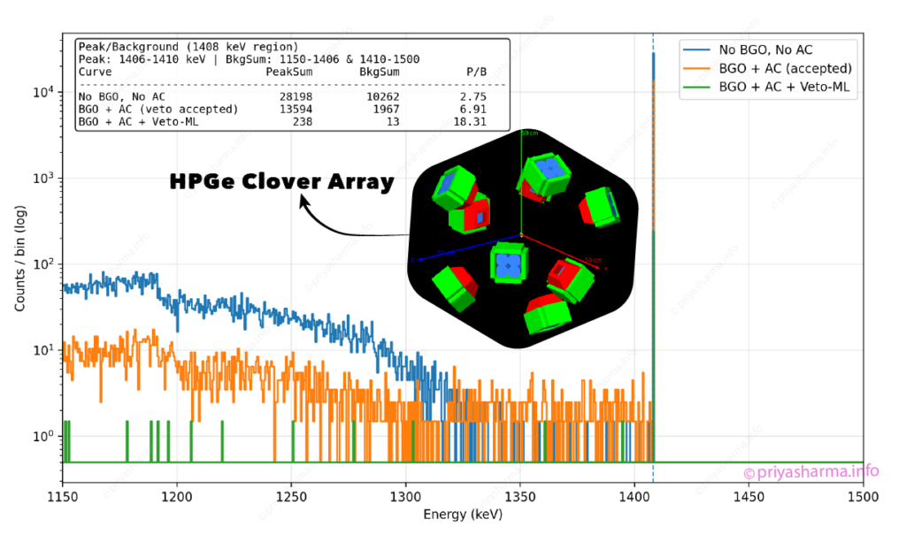 Here I ask the next question: can we still improve peak-to-background ratio even after using BGO + active collimation? I show that the answer can be yes, using a veto-trained ML “virtual veto” that learns event topology from the HPGe Clover itself.